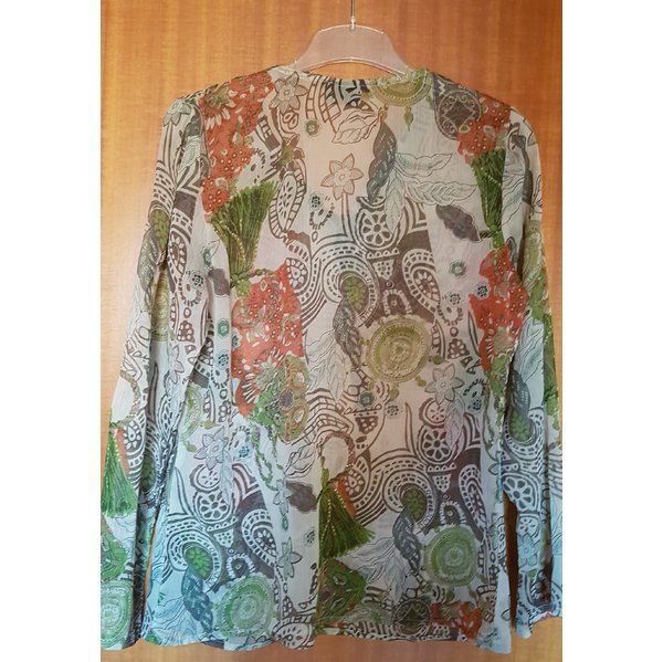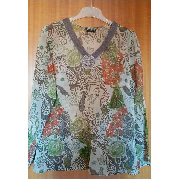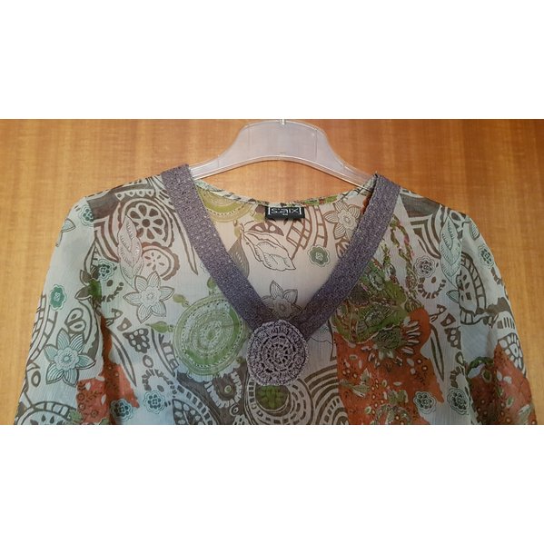 Tunika aus leicht transparentem Stoff. Am Halsausschnitt mit Häkelapplikation. Ein wirklicher Hingucker. Länge 66 cm, Taille 45 cm, Achselweite 48 cm.