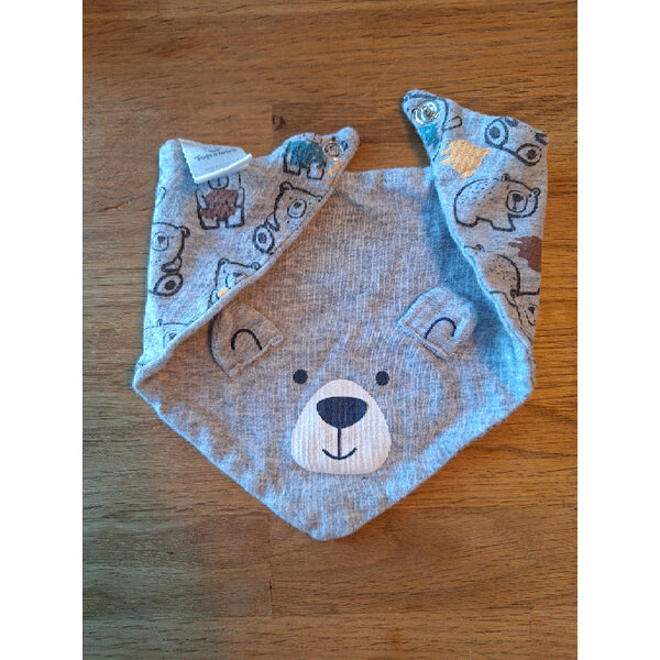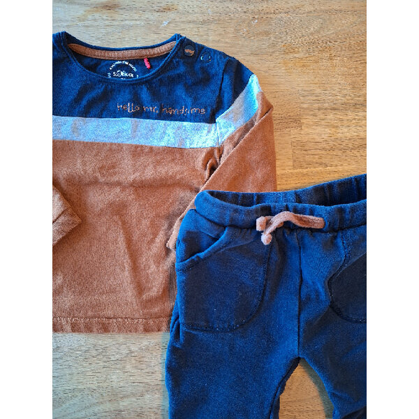 Set aus dunkelblauer Hose mit Longsleeve mit blauen, cognacfarbenen und grauen Streifen. Dazu ein passendes Halstuch zweiseitig tragbar (grauer Bärenkopf oder Bärenmuster). Das Set von s.Oliver hat die Größe 74cm (6-9 Monate).