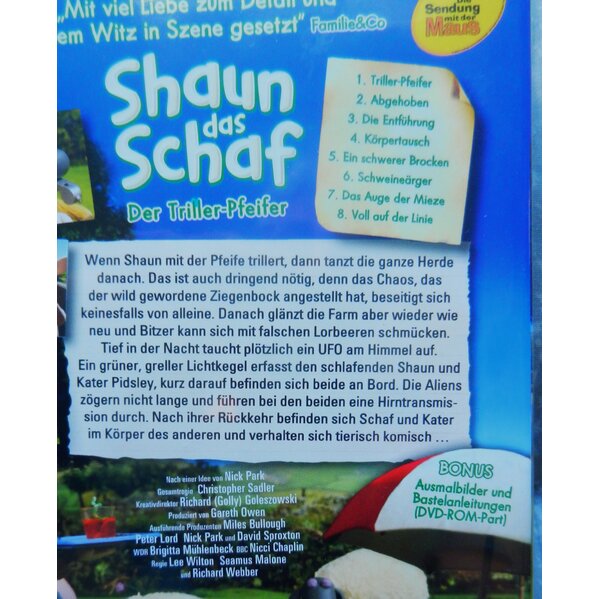 Shaun das Schaf geht in eine neue Runde und hat in 8 neuen Folgen die Lachmuskeln wieder fest im Griff. In "Der Triller-Pfeifer" merkt man sogleich wer der eigentlich Chef auf der Farm, irgendwo im ländlichen England, ist - und das ist keineswegs der Bauer. Auch wenn Shaun meist das große Chaos selbst anzettelt, ist er auch derjenige der mit pfiffigen Ideen das Ganze wieder hinbiegt. Doch gegen Aliens ist auch Shaun nicht gewappnet - als er und der Kater Pidsley entführt werden, finden sie sich nach einem Experiment im Körper des anderen wieder - die Hofbewohner verstehen diese tierisch-komische Situation überhaupt nicht!
