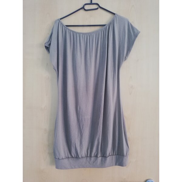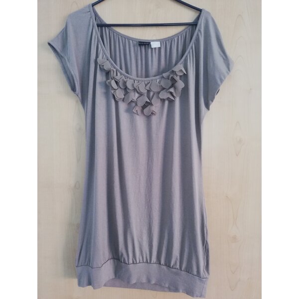 bequemes langes T-Shirt aus lockerleichtem Stoff in einem hellen Khaki-Ton, mit netter Blütenverzierung am Ausschnitt