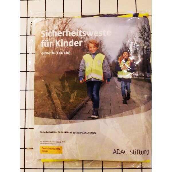 Neu und original verpackt: Sicherheitsweste für Kinder, Gr. M (134/140), perfekt für die dunkle Jahreszeit.