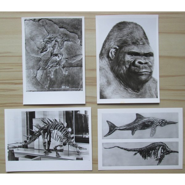 Insgesamt 7 ungelaufene "Echt Foto"-Postkarten aus dem Museum für Naturkunde Berlin (70er/80er Jahre). Davon 5 Motive aus der Paläontologischen Abteilung: "Ichtyorsaurier der Jurazeit", "Stachelschwanzsaurier aus der jüngsten Jurazeit", "Der Urvogel Archaeopteryx", "Flugsaurier Pterodaktylus" , "Seelilie Seirocrinus subangularis", und 2 Motive aus der Zoologischen Abteilung "Kopf des Gorilla "Bobby"" und "Tiroler Alpen in früherer Zeit".