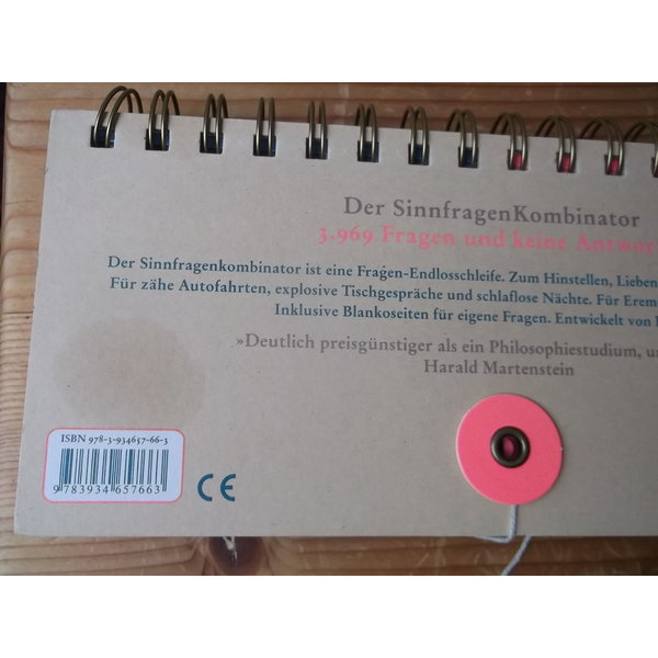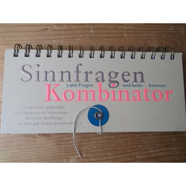 3969 Fragen und keine Antwort ;) Der Sinnfragen-Kombinator kann aufgestellt werden und durch die Zweiteilung zum Umblättern können zahllose inspirierende Fragen erstellz werden. Tiefsinnig und amüsant..und deutlich preisgünstiger als ein Philosophiestudium!
