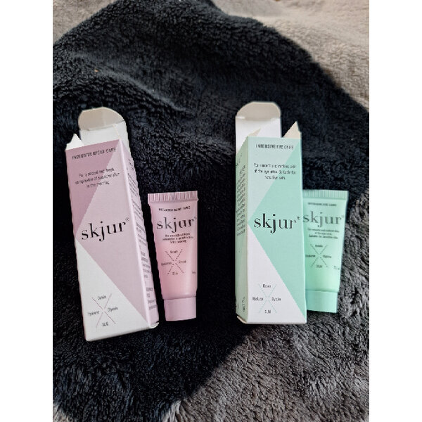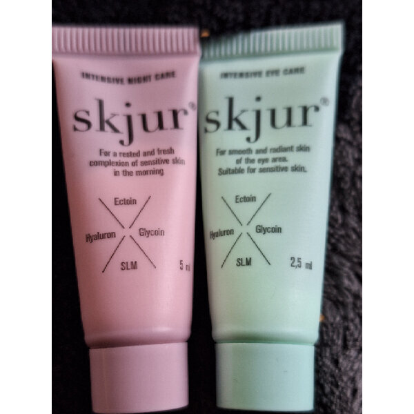 Augenpflege 2,5 ml (15 ml kosten ca 20 Euro), Nachtpflege 5ml ( 50 ml kosten ca 30 Euro), Skjur ist eine deutsche Apothekenmarke