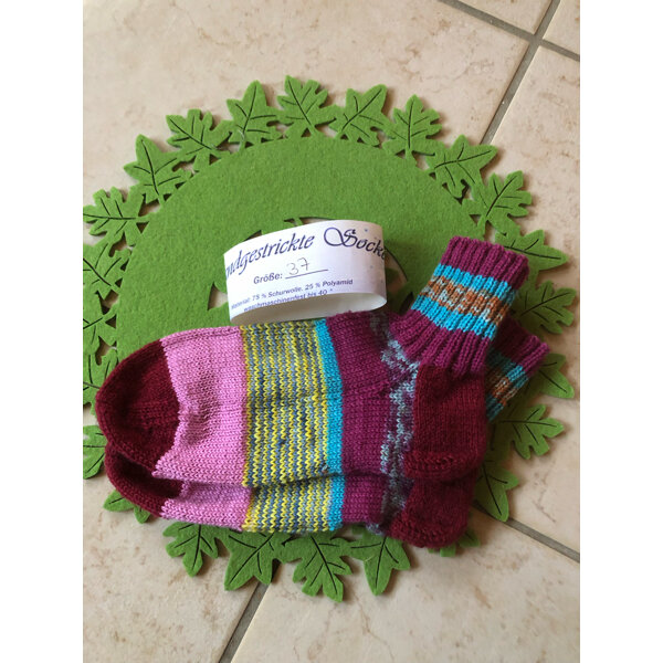 Daher biete ich handgefertigte Socken . Bestehen aus 75% Schurwolle und 25% Polyamid und sind Maschinen waschbar.