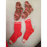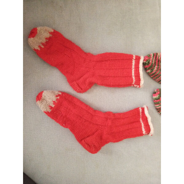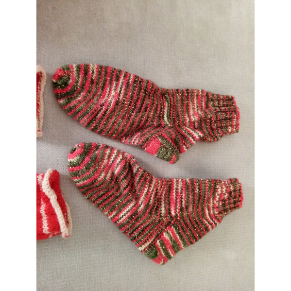 Selbstgestrickte wunderschöne Buntstiftsocken und weihnachtliche Glitzersöckchen in der Größe 24/25. Wurden von meinem Sohn gerne getragen, leider nun zu klein geworden.
