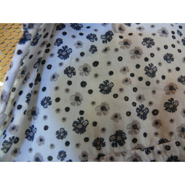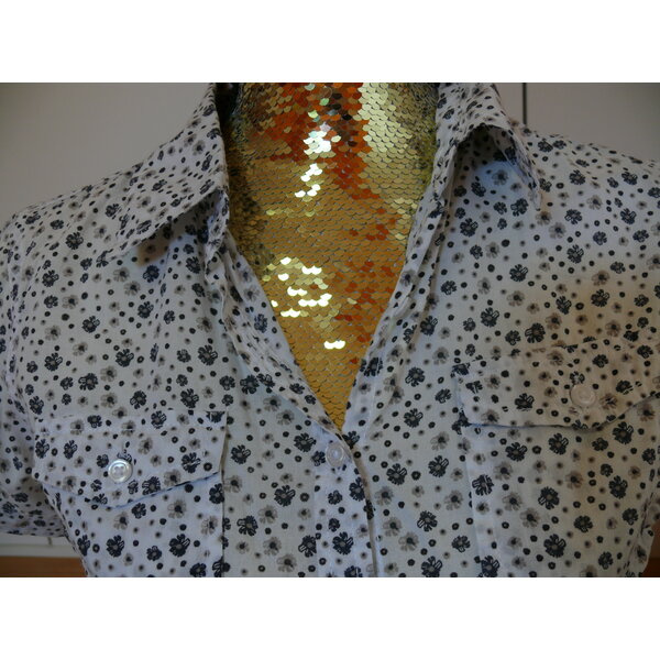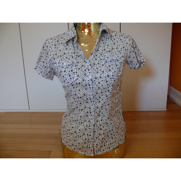 Eine kurzärmeliger Sommerbluse für Damen oder Mädchen. Hintergrundfarbe ist weiß. Die Blümchen und Punkte sind dunkelblau und grau. Weiße, kleine Knöpfe. Das Etikett in den Seitennähten wurde rausgeschnitten.