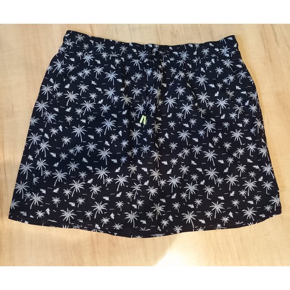Grundfarbe schwarz mit weißen Palmen, leicht fließendes Material. Mit seitlichen Eingrifftaschen. Bund ungedeht 45, durch Gummizug dehnbar bis 48 cm. Länge 46,5 cm.