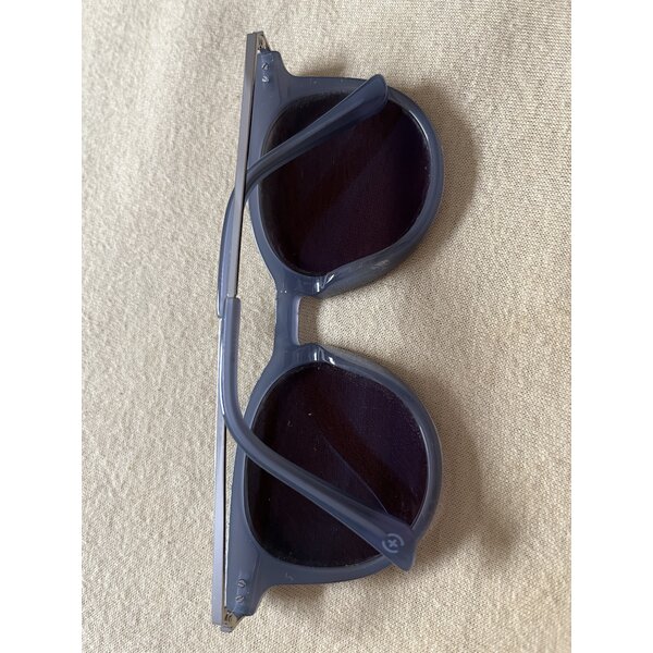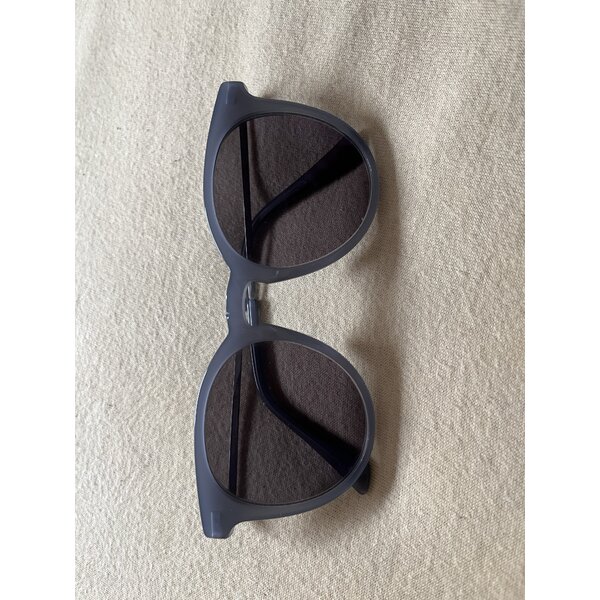 Sonnenbrille mit grauem Kunststoffrand udn Metallbügeln, eher runde Gläser.