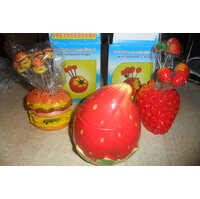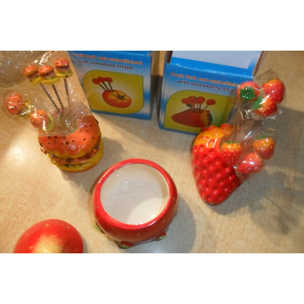 Obstgabeln/-piekser-Set mit Erdbeerenmotiv und Burgermotiv, dazu ein Erdbeerdöschen, alle Teile unbenutzt, Details siehe Bilder