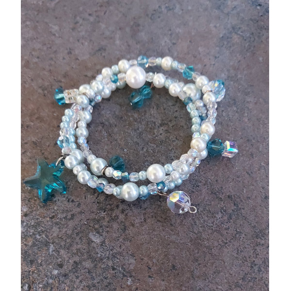 Spiralarmreif mit Perlen weiss,blau und durchsichtig,mit hängenden Elementen,passt sich Armumfang an