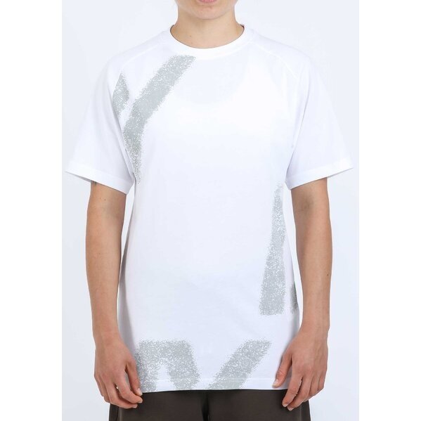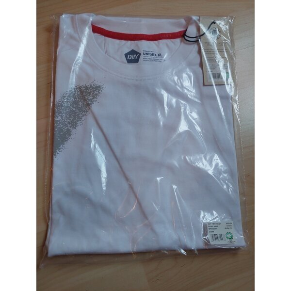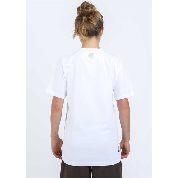 Entspannt geschnittenes, weißes T-Shirt aus festem und hochwertigem Jersey mit angeschnittenem DIIY Print, der an die Kreidelinien vom Spielfeld am Millerntor erinnert. Mit einfarbigem ST PAULI Wappen im Nacken und Regenbogen-Authenticlabel am unteren Bund. Das T-Shirt ist unisex und wird zu 100% aus Biobaumwolle in Portugal produziert.