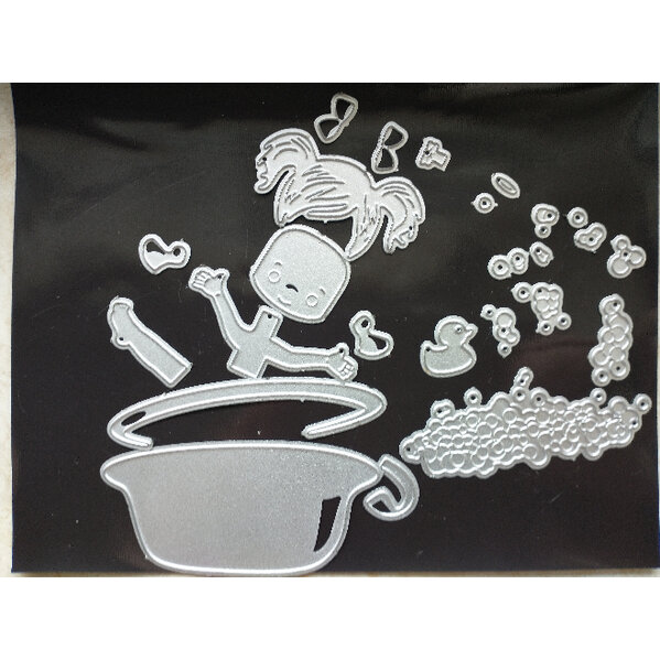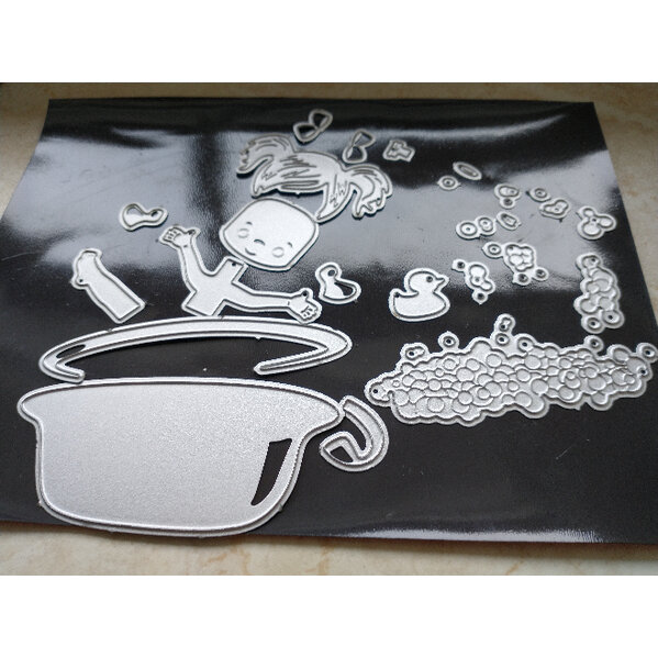Stanzenset für ein Mädchen in der Badewanne.Das Bein muß zweimal ausgestanzt werden,da,das Mädchen seitlich in der Wanne sitzt.Habe versucht die Stanzen so auf dem Bild zu legen wie es später zusammen gesetzt werden kann.Eine Präge -und Stanzmaschine ist Voraussetzung zum ausstanzen