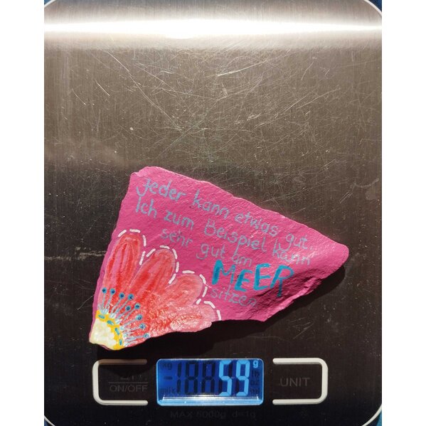 Handverlesen und Handbemalt mit Acrylfarbe und anschließender Lackversiegelung auf der Vorderseite