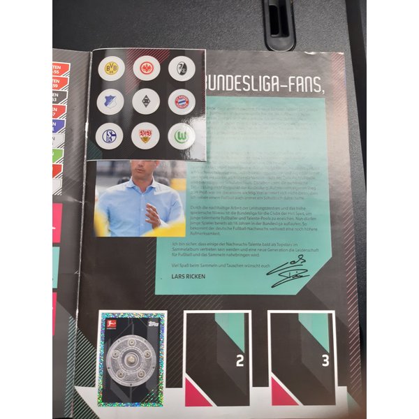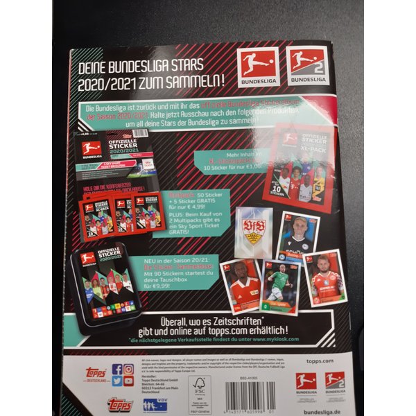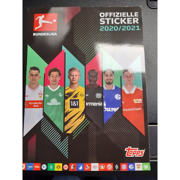 Wenig befülltes Stickeralbum für Sammelbilder von der Bundesliga-Saison 2020-2021, dazu Panini-Heft "Offizielle Sticker- und Cards-Kollektion FC Bayern Müchen 2020/2021"