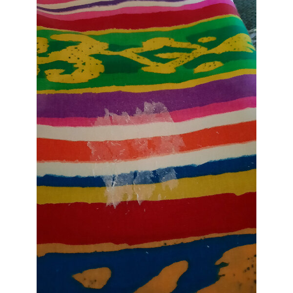 Ein poppigen Stoff von Ikea liegt schon länger in einem Koffer, also lichtgedchützt. An einer Stelle war ein Aufkleber, den ich mit Wasser teilweise entfernen konnte. Beim Waschen wird er ganz abgehen ( siehe Foto 2)