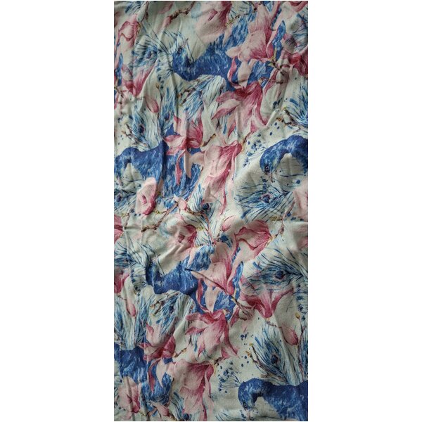 Neues Stoffstück mit hellblauen und rosafarbenen Blumen auf weißem Untergrund, jersey
