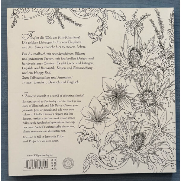 Die zeitlose Liebesgeschichte von Elizabeth und Mr. Darcy erwacht hier zu neuem Leben. Das Ausmalbuch zum Klassiker der Weltliteratur von Jane Austen bietet wunderschöne Bilder und Szenen und handverlesene Zitate. Es geht um Liebe und Intrigen, Gefühle und Romantik, Krisen und Enttäuschung – und um ein Happy End. Zweisprachige Ausgabe mit Zitaten in Deutsch und Englisch.
