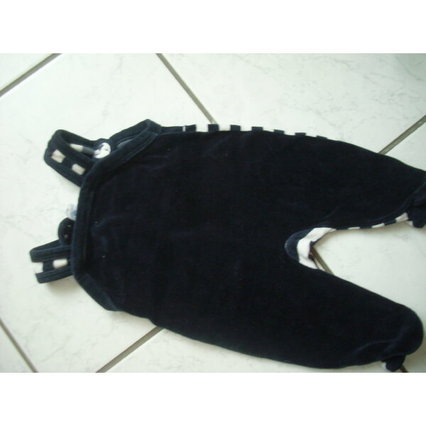 Ein süßer Strampler von Disney at C&A in Größe 62 aus weichem Nickistoff in weiss-blau gestreift. (Hinten ist er uni blau) und vorne mit dem süße Winnie Puh drauf. Er hat vorne noch 2 aufgesetzte Taschen, die Träger können mit einem Knopf geschlossen werden.