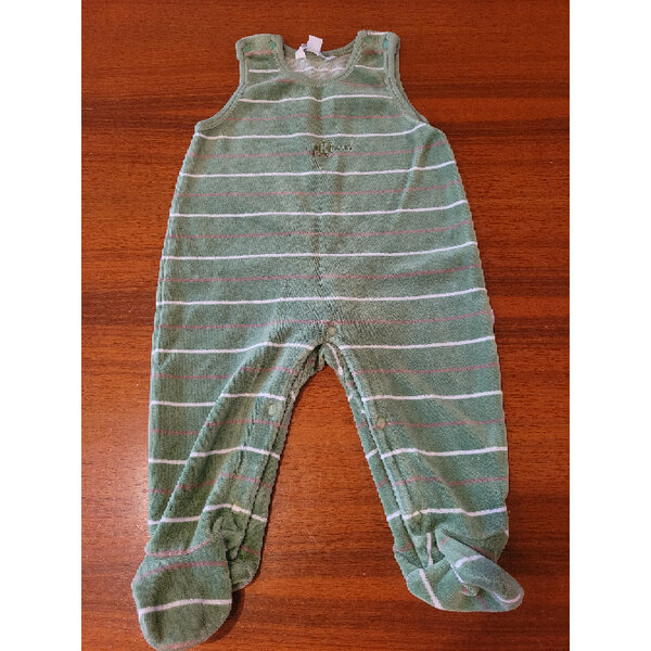 Grüner Nicki-Strampler mit Streifen, oben und zwischen den Beinen Druckknöpfe