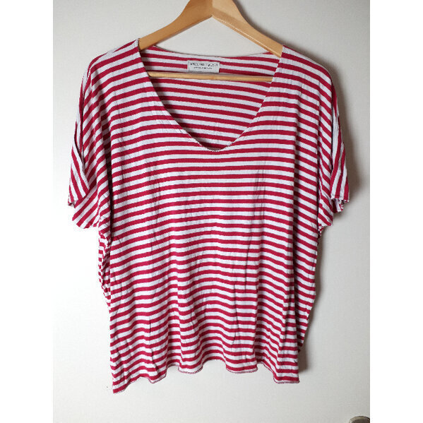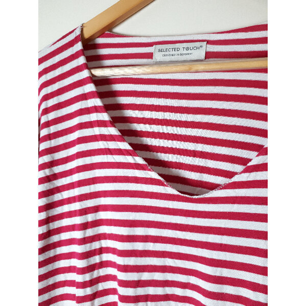 Lockeres Ringelshirt mit Fledermausärmeln und weiten Ausschnitt. Kanten sind mit Glitzergarn eingefasst. Brustweite ca. 62cm, Länge 61cm.