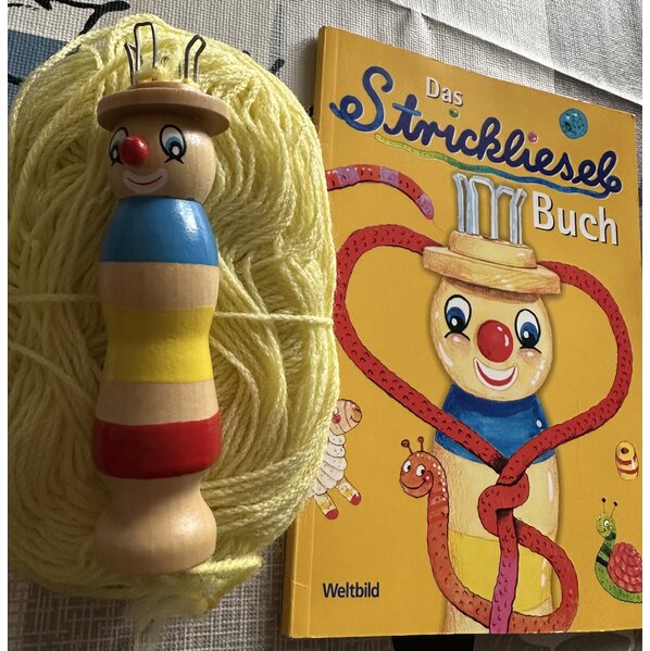 Strickliesel als Clown mit einem gelben Garnknäuel und einem Buch für viele Bastelideen