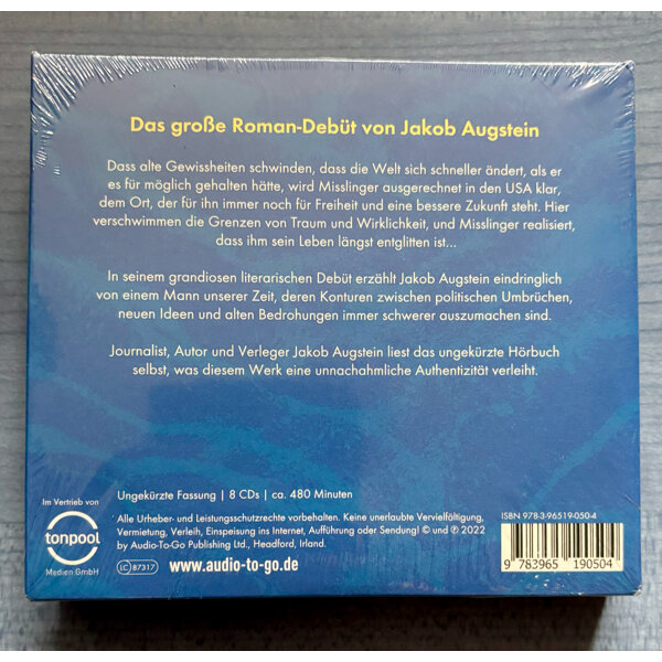 Dass alte Gewissheiten schwinden, dass die Welt sich schneller ändert, als er es für möglich gehalten hätte, wird Misslinger ausgerechnet in den USA klar, dem Ort, der für ihn immer noch für Freiheit und eine bessere Zukunft steht. Hier verschwimmen die Grenzen von Traum und Wirklichkeit, und Misslinger realisiert, dass ihm sein Leben längst entglitten ist… In seinem grandiosen literarischen Debüt erzählt Jakob Augstein eindringlich von einem Mann unserer Zeit, deren Konturen zwischen politischen Umbrüchen, neuen Ideen und alten Bedrohungen immer schwerer auszumachen sind. 8 Audio-CDs, 488 Minuten Gesamtspielzeit. ℗ + © 2022 by Audio-To-Go Publishing Ltd., Ireland. © Buchvorlage by Aufbau Verlag, Berlin