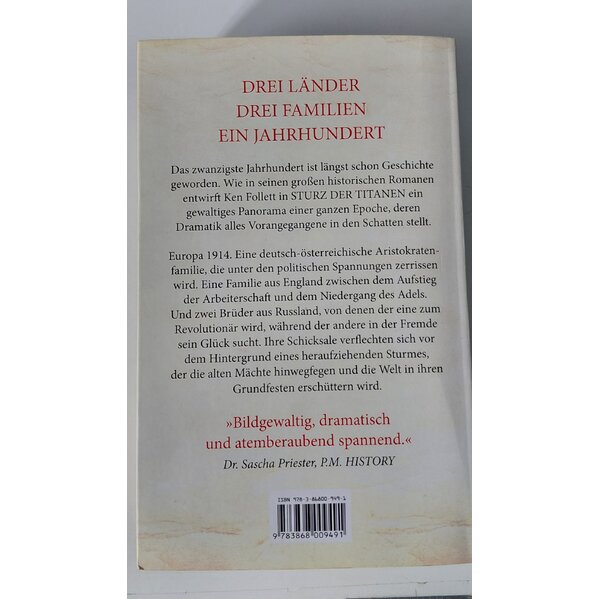 Als in sich abgeschlossener historischer Roman ist STURZ DER TITANEN der spannende Auftakt von Ken Folletts Jahrhundert-Trilogie, die mit WINTER DER WELT fortgesetzt wird und mit KINDER DER FREIHEIT ihren Abschluss findet.