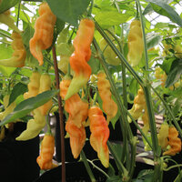 Die "Sugar Rush Peach Stripey" ist eine Chilipflanze, die für ihre auffällig gestreiften Früchte bekannt ist. Sie hat einen fruchtig-süßen Geschmack mit einer moderaten bis mittleren Schärfe (etwa 25.000-50.000 SHU) und entwickelt ihre roten Streifen erst bei voller Reife auf einer pfirsichfarbenen bis orangen Grundfarbe. Ihr Name leitet sich von der ursprünglichen Sorte "Sugar Rush Peach" ab, von der sie eine gestreifte Variante ist