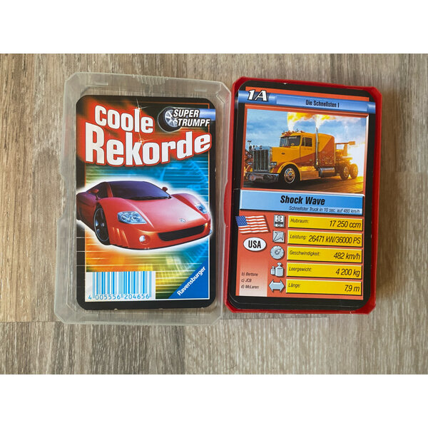 Hey, ich biete euch hier dieses vollständige Super Trumpf Quartett mit coolen Rekorden an. Bespielt aber guter Zustand.