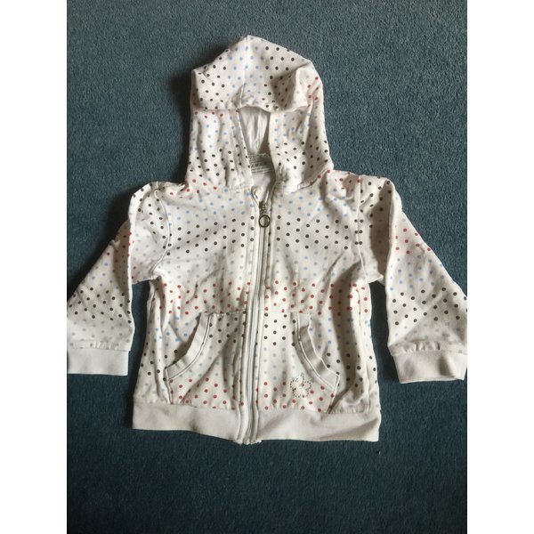 97% BW, 3% Elastan, weiße Jacke mit roten, blauen und grauen Punkten sowie einer Blume aus silbernen Steinchen auf der linken Tasche