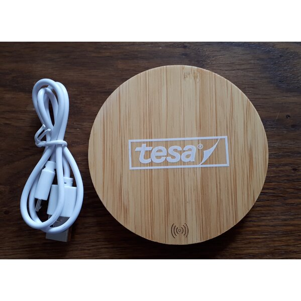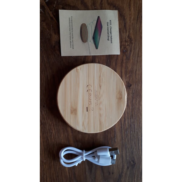 ein neues, unbenutztes wireless Handyladegerät mit Schale aus echtem Bambus mit Ladekabel und Gebrauchsanweisung in Originalverpackung