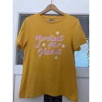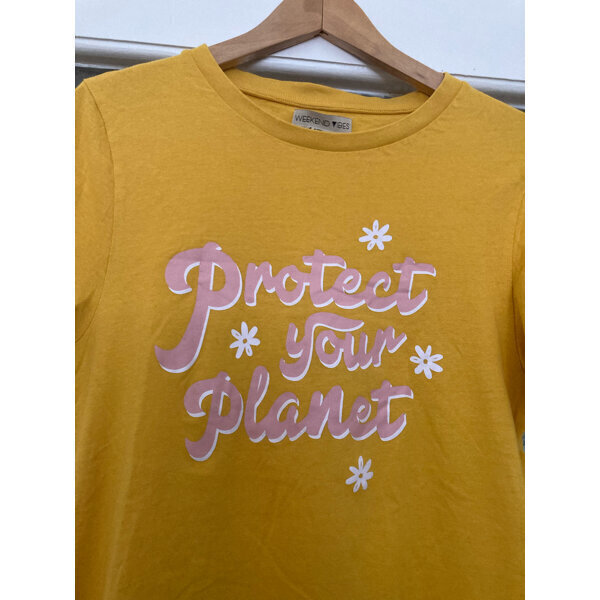 T-Shirt reine Baumwolle in schönem Gelb mit Aufschrift in rosa: Protect your Planet (beschütze deinen Planeten)