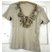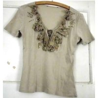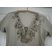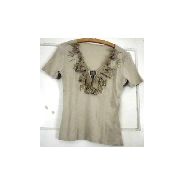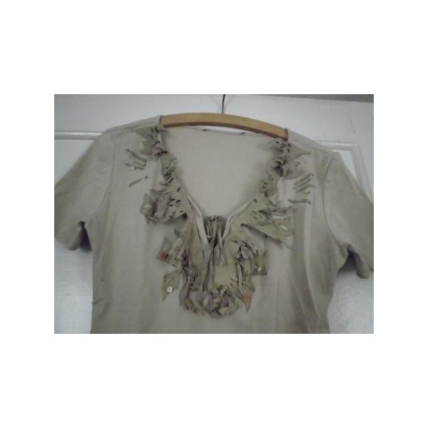 klassisches T-Shirt mit aufgenähten Applikationen aus Leder, teilweise zusätzlich kleine Perlen, Perlmutt-Plättchen und Steinchen aufgenäht... V-Ausschnitt mit aufgenähtem und fransig geschnittenem Leder verziert... Ausschnitt zusätzlich mit Leder-Bindeband ohne Funktion verziert...