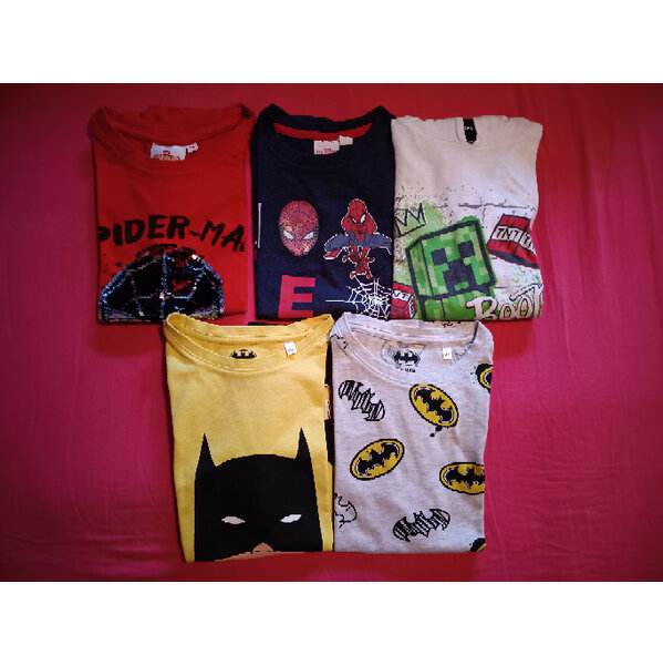 Wir bieten 5 T-Shirts für Jungen in Größe 128. Die T-Shirts haben die Motive: Spiderman, Batman & Minecraft zum Tausch an.