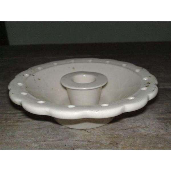 Der beigefarbene Tafelleuchter für eine Kerze aus Keramik ist tropfsicher ausgeführt und hat ein nostalgisches Flair.