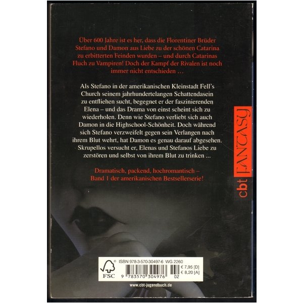 Vierhundert Jahre ist es her, dass die Florentiner Brüder Stefano und Damon aus Liebe zu der schönen Catarina zu erbitterten Feinden – und durch Catarinas Fluch zu Vampiren wurden. Und noch immer ist der Kampf der Brüder nicht entschieden.Eine dunkle Ahnung von drohendem Unheil überkommt die 17-jährige Elena, als sie eines sonnigen Morgens eine riesige schwarze Krähe entdeckt, deren Blicke sie unablässig wie aus Menschenaugen zu verfolgen scheinen … Doch kaum betritt Elena die Highschool, ist alle Angst vergessen, denn Hals über Kopf verliebt sie sich in den umwerfenden italienischen Neuzugang: Stefano. Zu ihrer großen Enttäuschung wirkt der zunächst alles andere als interessiert...