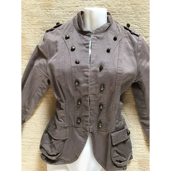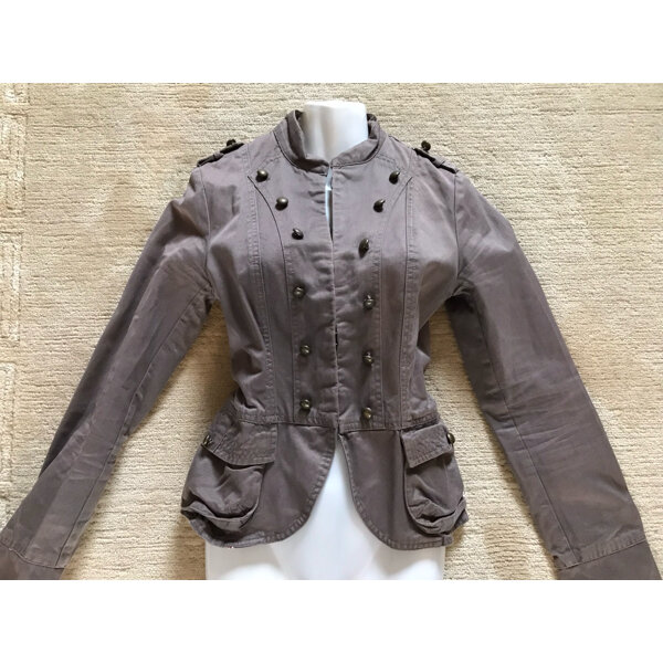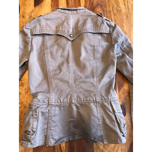 Stabiler Stoff, beige-khakifarben, körpernah und tailliert geschnitten. Schild im Nacken entfernt, daher weiß ich die Marke nicht mehr. Länge 61cm, Breite unter den Achseln 40cm, Ärmellänge 64cm. Guter Zustand ohne Mängel
