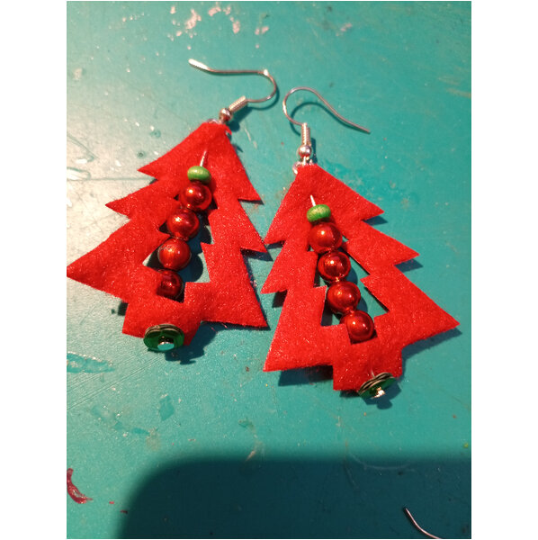 Ohrringe mit Tannenbäumen aus Filz und roten Glanzperlen, 6 cm Gesamtlänge
