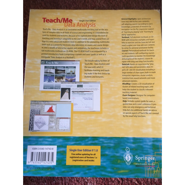 A powerful multimedia teachware on the analysis of complex data in science and engineering. Intended for students at all levels as well as lecturers, the package includes a comprehensive, hyper-linked textbook on data analysis. Additional highlights include: open architecture for use with any teaching material; interactive examples; self-adapting courses; a course- and exam-designer; protection of resources by encryption; a powerful, full-text indexing machine; and a data laboratory with sample data sets and import function for hands-on experience. The whole is complemented by 25 animations and 25 fully interactive applets to facilitate a "learning-by-doing" approach.