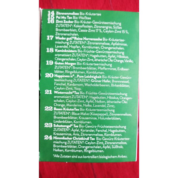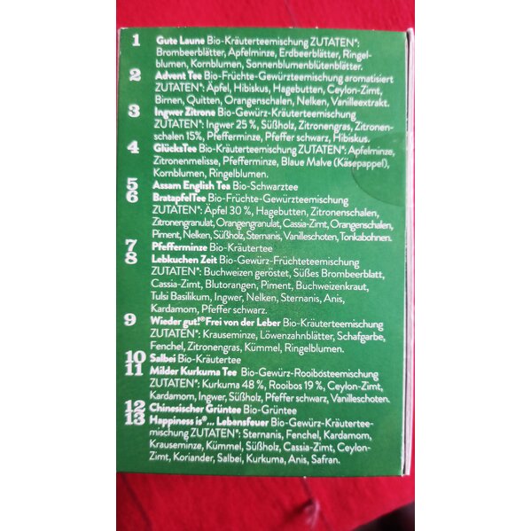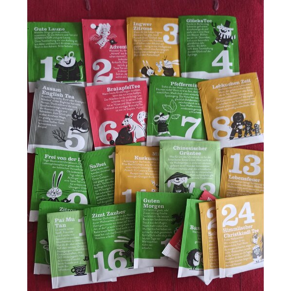 24 verschiedene Tees zum Durchprobieren. Jeder Teebeutel ist mit einer Nummer gekennzeichnet.