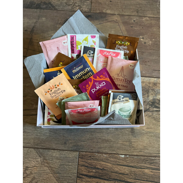 60 Teebeutel von verschiedenen Herstellern. Von den einzelnen Sorten sind meist 2-4 Beutel vorhanden. MHD ist von den meisten Tees natürlich weit länger als 2025.