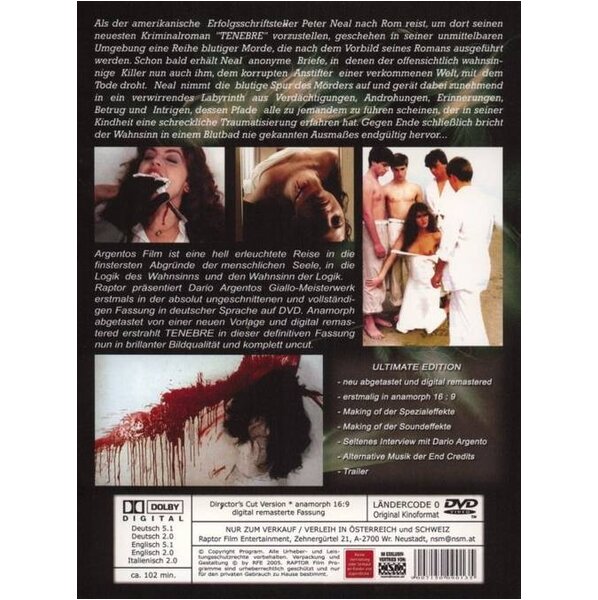 Als der amerikanische Erfolgsschriftsteller Peter Neal nach Rom reist, um dort seinen neuesten Kriminalroman "TENEBRE" vorzustellen, geschehen in seiner unmittelbaren Umgebung eine Reihe blutiger Morde, die nach dem Vorbild seines Romans ausgeführt werden. Schon bald erhält Neal anonyme Briefe, in denen der offensichtlich wahnsinnige Killer nun auch ihm, dem korrupten Anstifter einer verkommenen Welt, mit dem Tode droht. Neal nimmt die blutige Spur des Mörders auf und gerät dabei zunehmend in ein verwirrendes Labyrinth aus Verdächtigungen, Androhungen, Erinnerungen, Betrug und Intrigen, dessen Pfade alle zu jemandem zu führen scheinen, der in seiner Kindheit eine schreckliche Traumatisierung erfahren hat. Gegen Ende schließlich bricht der Wahnsinn in einem Blutbad nie gekannten Ausmaßes endgültig hervor...