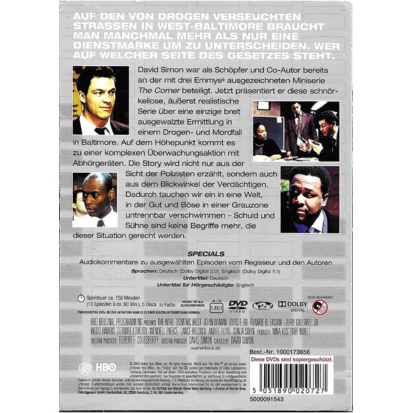 Die bei Fans und Kritikern gleichsam beliebte Crime-Serie "The Wire" spielt im Milieu von Polizisten, Kriminellen, Drogensüchtigen, Politikern und Journalisten in Baltimore. Dreh- und Angelpunkt der Handlung ist der Drogenhandel in der Stadt. In der ersten Staffel dreht sich alles um den Mordprozess gegen Drogenbaron D'Angelo Barksdale. Kaum dingfest gemacht muss Detective Jimmy McNulty allerdings hilflos mit ansehen, wie die Kronzeugin der Staatsanwaltschaft ihre aussage unerwartet zurückzieht. Ohne diesen entscheidenden Beweis fällt die anklage in sich zusammen und D'Angelo kann seiner Bestrafung entkommen.