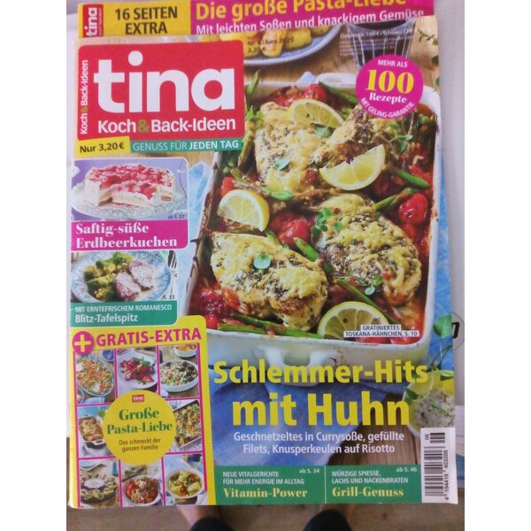 Tina Koch- & Back-Ideen Juni 2025 + Extra-Heft mit 16 Seiten Die große Pasta-Liebe mit leichten Soßen und knackigem Gemüse u. a. mit diesen Themen: Mehr als 100 Rezepte mit Geling-Garantie und vielen Fotos. Schlemmer-Hits mit Huhn - Geschnetzeltes mit Currysoße, gefüllte Filets, Knusperkeulen auf Risotto und vieles mehr. Blitz-Tafelspitz mit erntefrischem Romanesco, saftig-süße Erdbeerkuchen.......