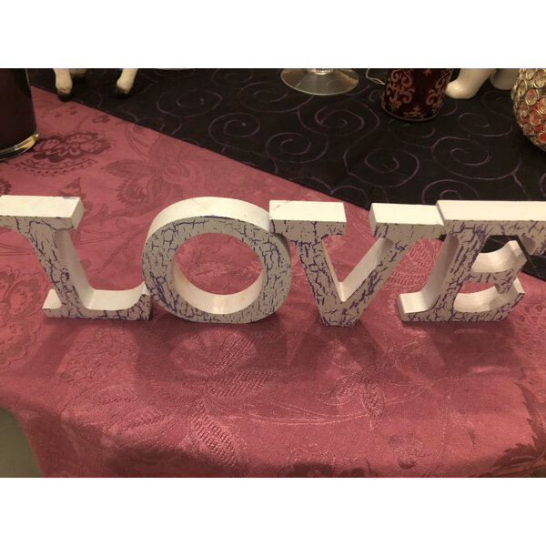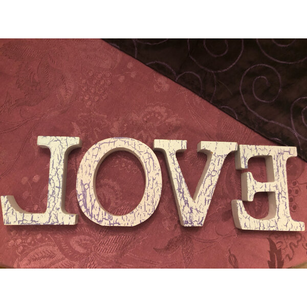 Sehr guter Zustand. Perfekt für eine Tischdeko einfach so oder für Verliebte. Zur Hochzeit zum Beispiel. Höhe 10 cm. Ganze Länge 34 cm. Buchstabe sind aus Holz. Sehr leicht. Ein schönes Lila.