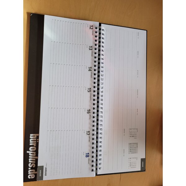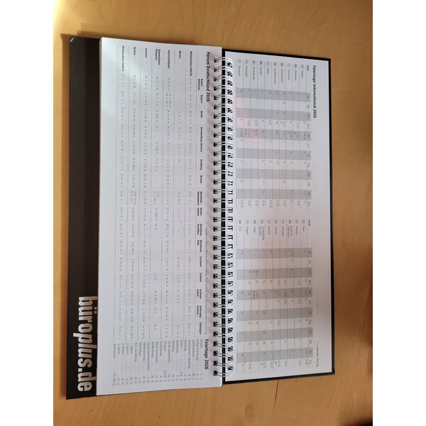 Aufteilung: 1 Seite Kalenderjahr, 3 Seiten Monatsübersicht 3 Jahre, 1 Seite Feiertage aktuelles Jahr, 1 Seite Ferien aktuelles Jahr, 1 Seite Feiertage Folgejahr, 1 Seite Ferien Folgejahr, 116 Seiten Kalendarium (1 Woche/1 Seite und 1 Seite für Tagesnotizen), 2 Seiten Adressen.