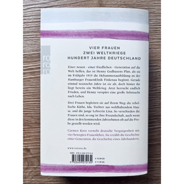 Vier Frauen, Zwei Weltkriege, Hundert Jahre DeutschlandEiner neuen – einer friedlichen – Generation auf die Welt helfen, das ist Henny Godhusens Plan, als sie im Frühjahr 1919 die Hebammenausbildung an der Hamburger Frauenklinik Finkenau beginnt. Gerade einmal neunzehn Jahre ist sie alt, doch hinter ihr liegt bereits ein Weltkrieg. Jetzt herrscht endlich Frieden, und Henny verspürt eine große Sehnsucht nach Leben. Drei Frauen begleiten sie auf ihrem Weg: Ida wohnt in einem der herrschaftlichen Häuser am Hofweg und weiß nicht viel von der Welt jenseits der Beletage. Hennys Kollegin Käthe dagegen stammt aus einfachen Verhältnissen und unterstützt die Kommunisten. Und Lina führt als alleinstehende Lehrerin ein unkonventionelles Leben. Die vier Frauen teilen Höhen und Tiefen miteinander, persönliche Schicksalsschläge und die Verwerfungen der Weltpolitik, vor allem der Aufstieg der Nationalsozialisten und der drohende Zweite Weltkrieg, erschüttern immer ...