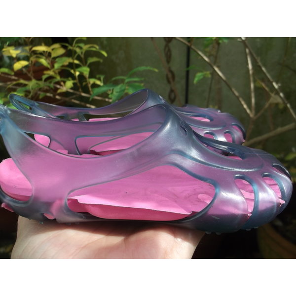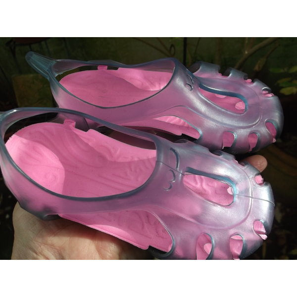 Ein Paar hünsche Badesandalen für die Kleinsten in zartem durchsichtigem Fliederton. Mit praktischer Lasche hinten zum leichteren Anziehen.