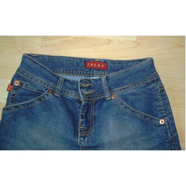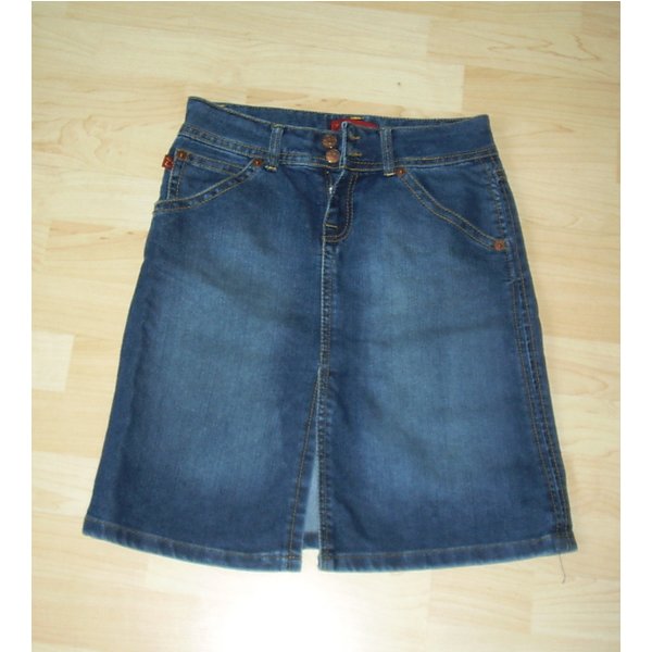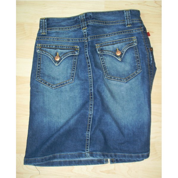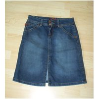 Toller Jeansrock mit den fünf üblichen Jeanstaschen, aus dickerem Jeansstoff. Das Bund ist 4 cm breit und wird mit zwei Knöpfen vorne geschlossen und mit einem kleinen Reißverschluss. Die Potaschen werden mit einem Knopf geschlossen. Hinten glatt und vorne mit einem ca. 20 cm langen Schlitz.
